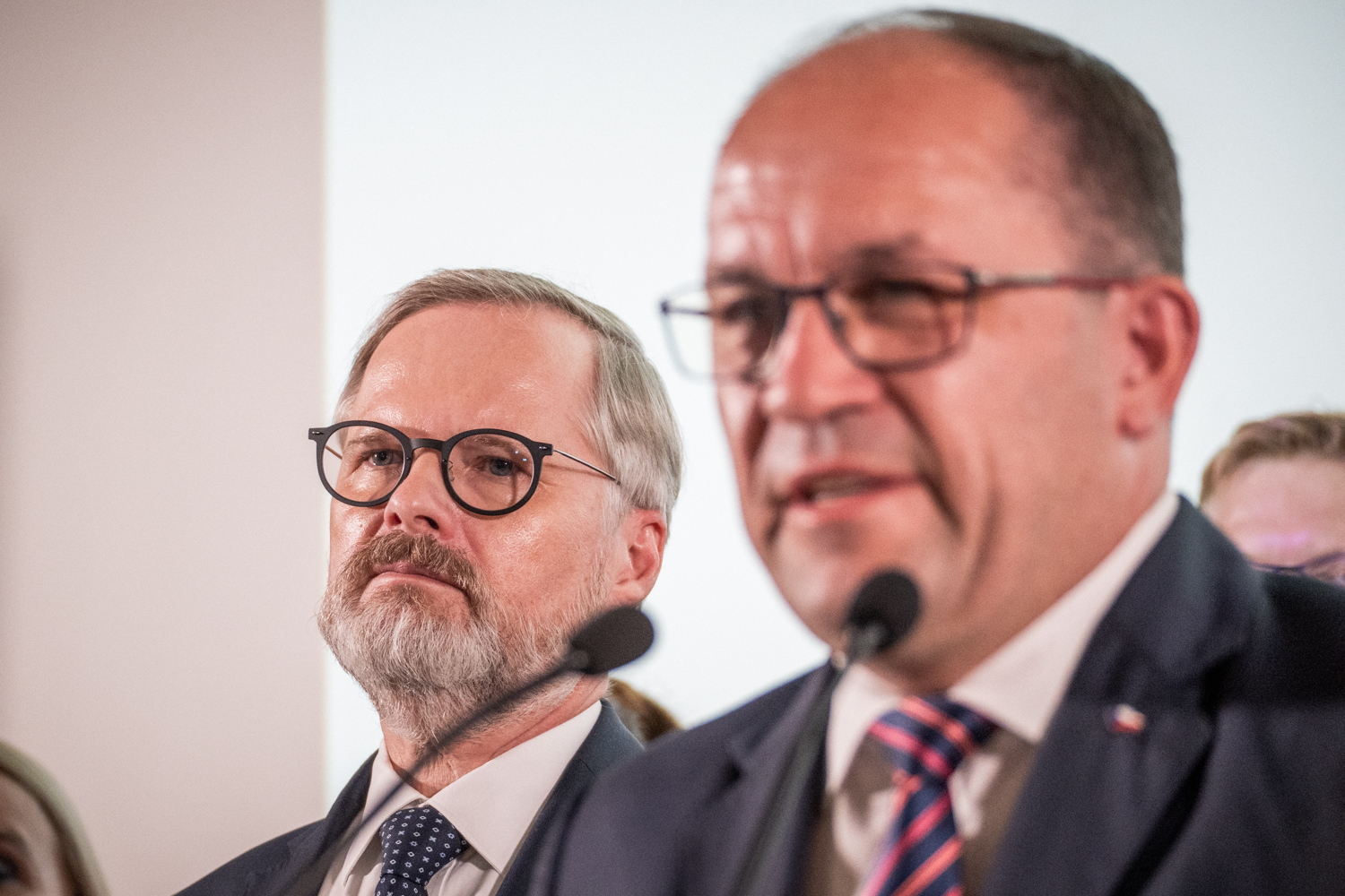 Galerie | OBRAZEM: Lídři Spolu po tiskovce urychleně zmizeli