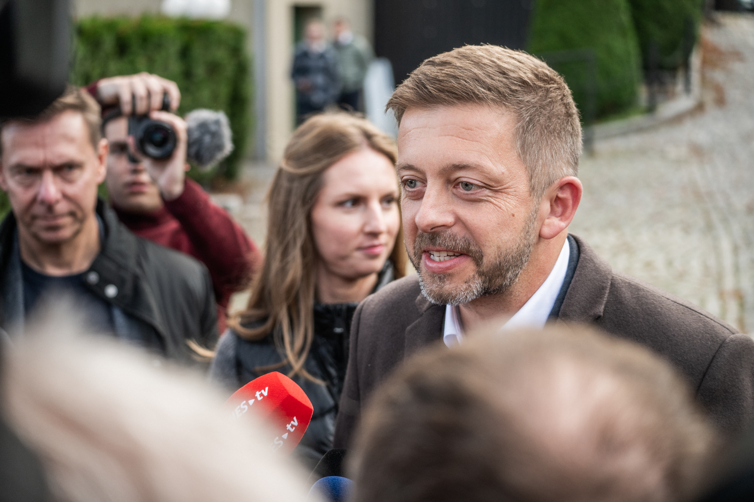 OBRAZEM: Lídři Spolu po tiskovce urychleně zmizeli